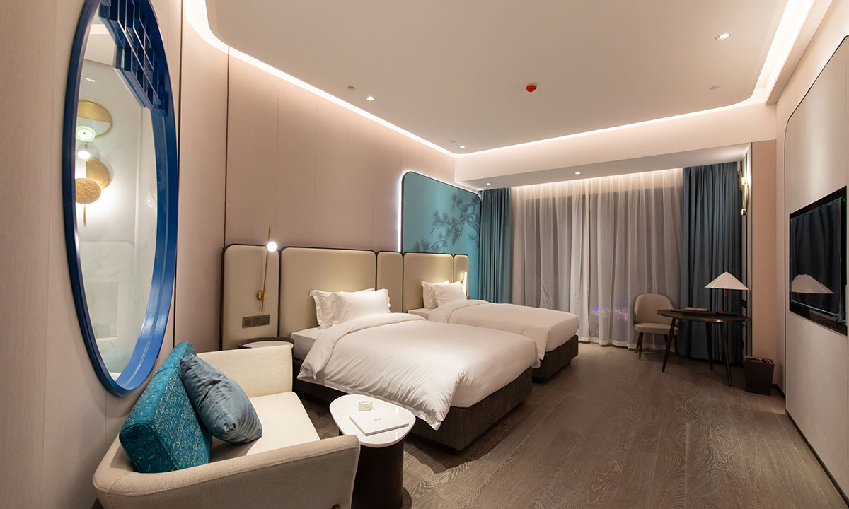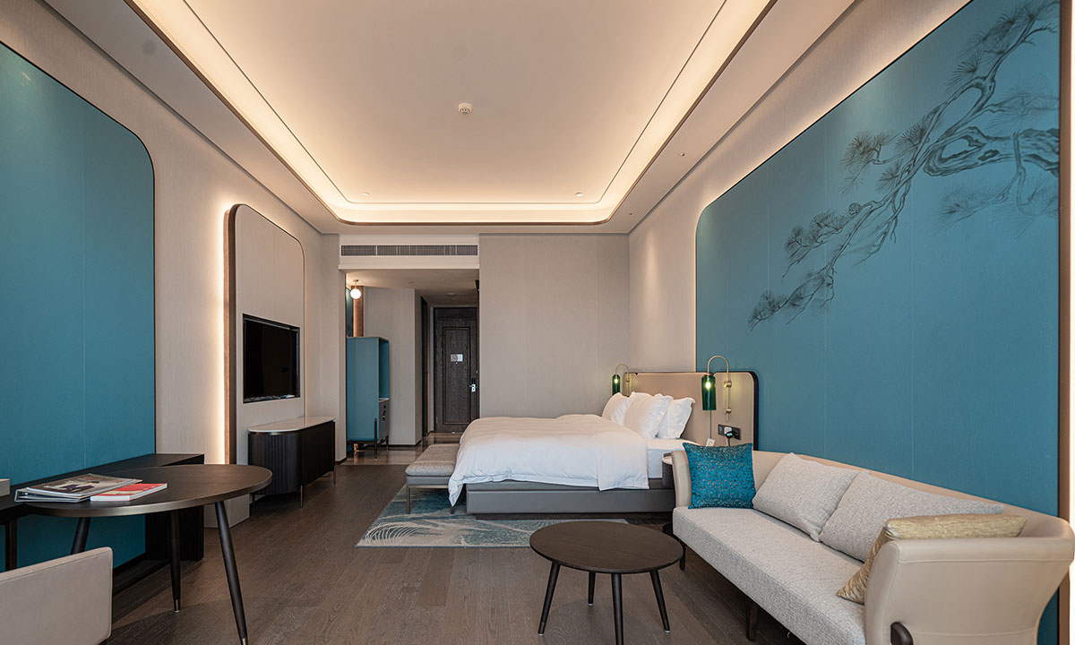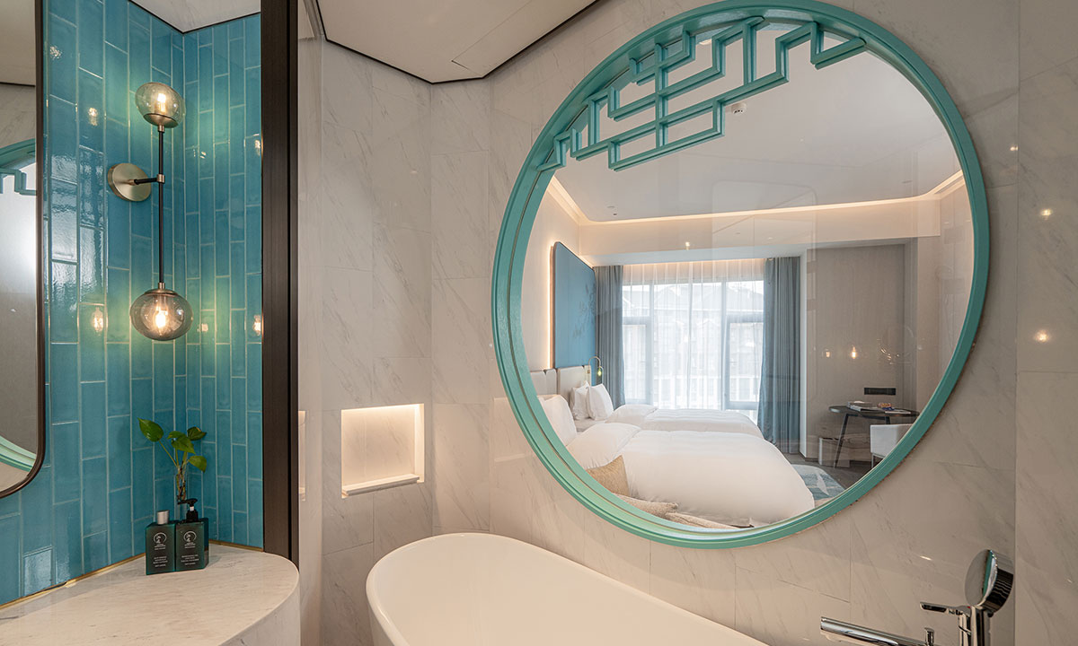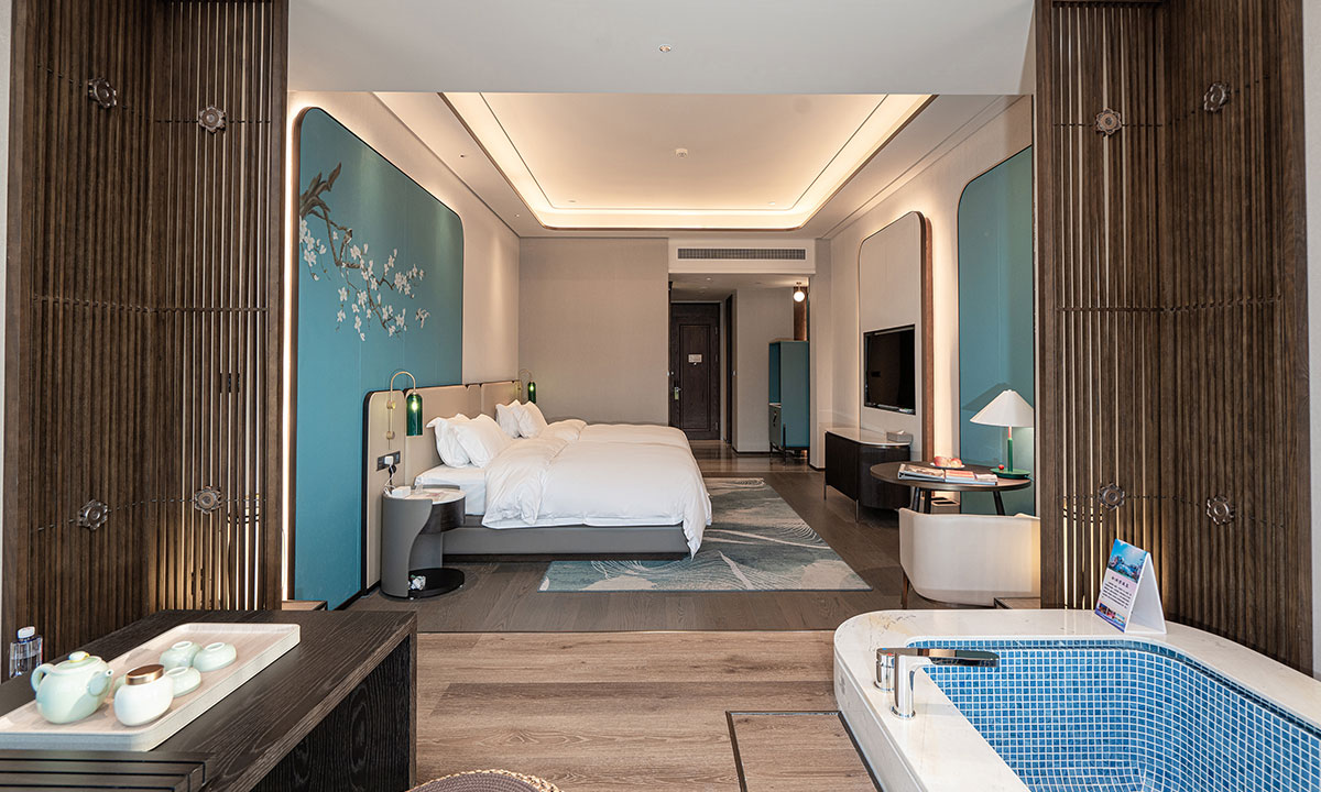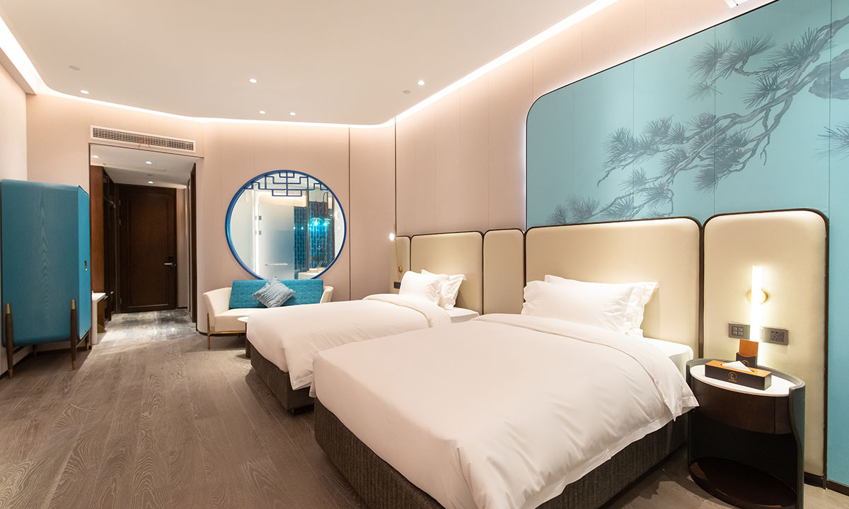 昆曲艺术客房,昆曲主题房又分为Tiffany蓝昆和粉红粉昆。色彩细腻柔美家具陈设简约大气,让人一夜梦回《牡丹亭》、《西厢记》。