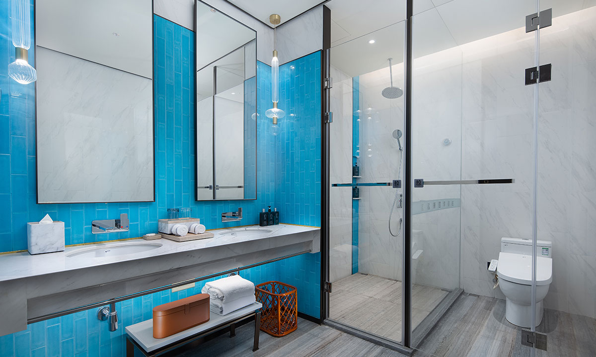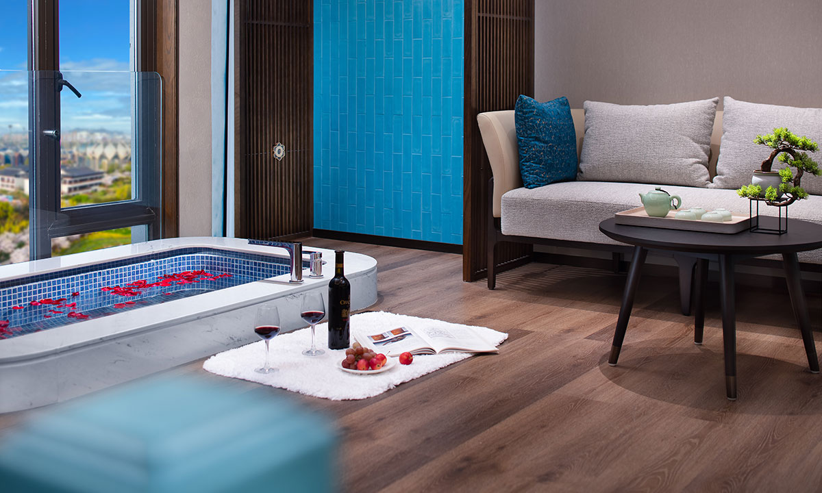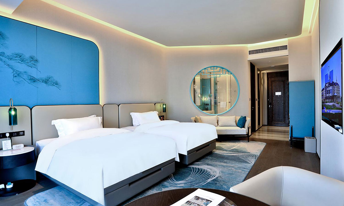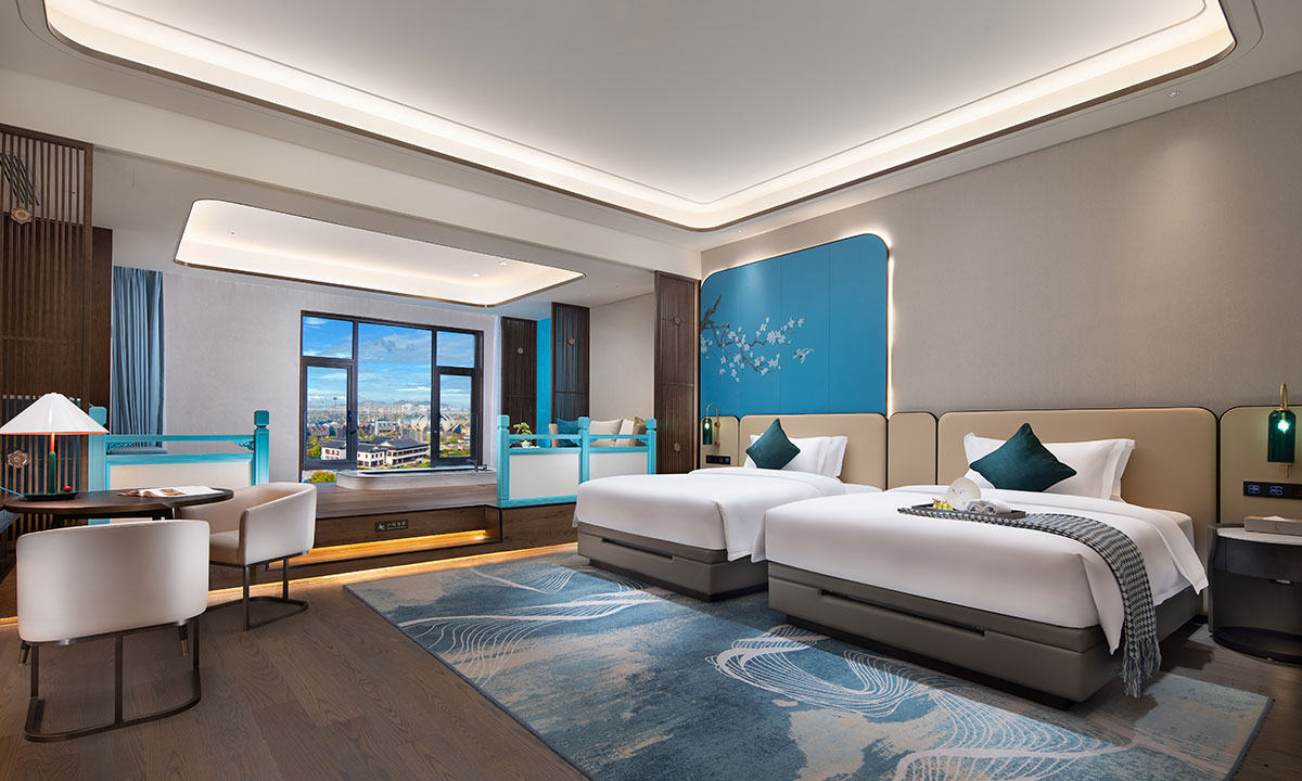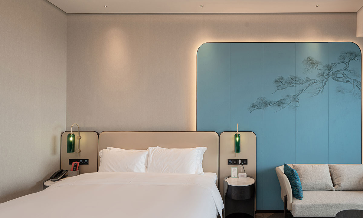 昆曲艺术客房,昆曲主题房又分为Tiffany蓝昆和粉红粉昆。色彩细腻柔美家具陈设简约大气,让人一夜梦回《牡丹亭》、《西厢记》。