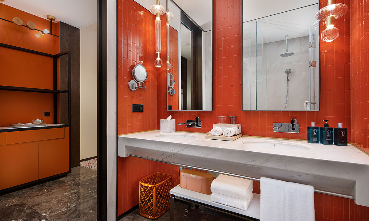 皮影戏艺术客房,采用爱马仕橙为底色,色彩浓烈鲜艳,把皮影戏中的光影变化加以放大,犹如镜中水月,虚实相间,置身于流动梦幻的空间当中。