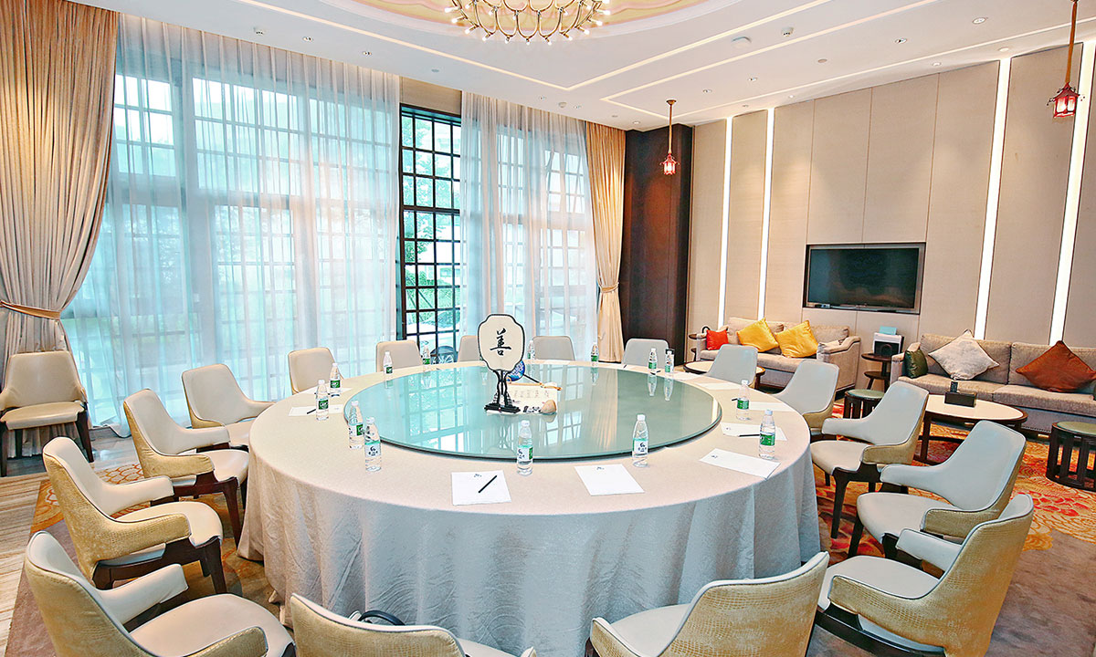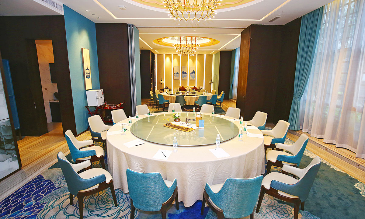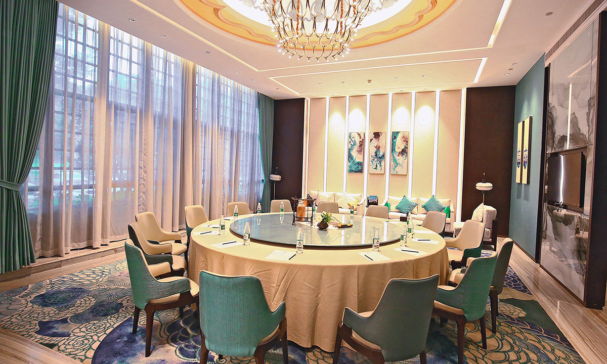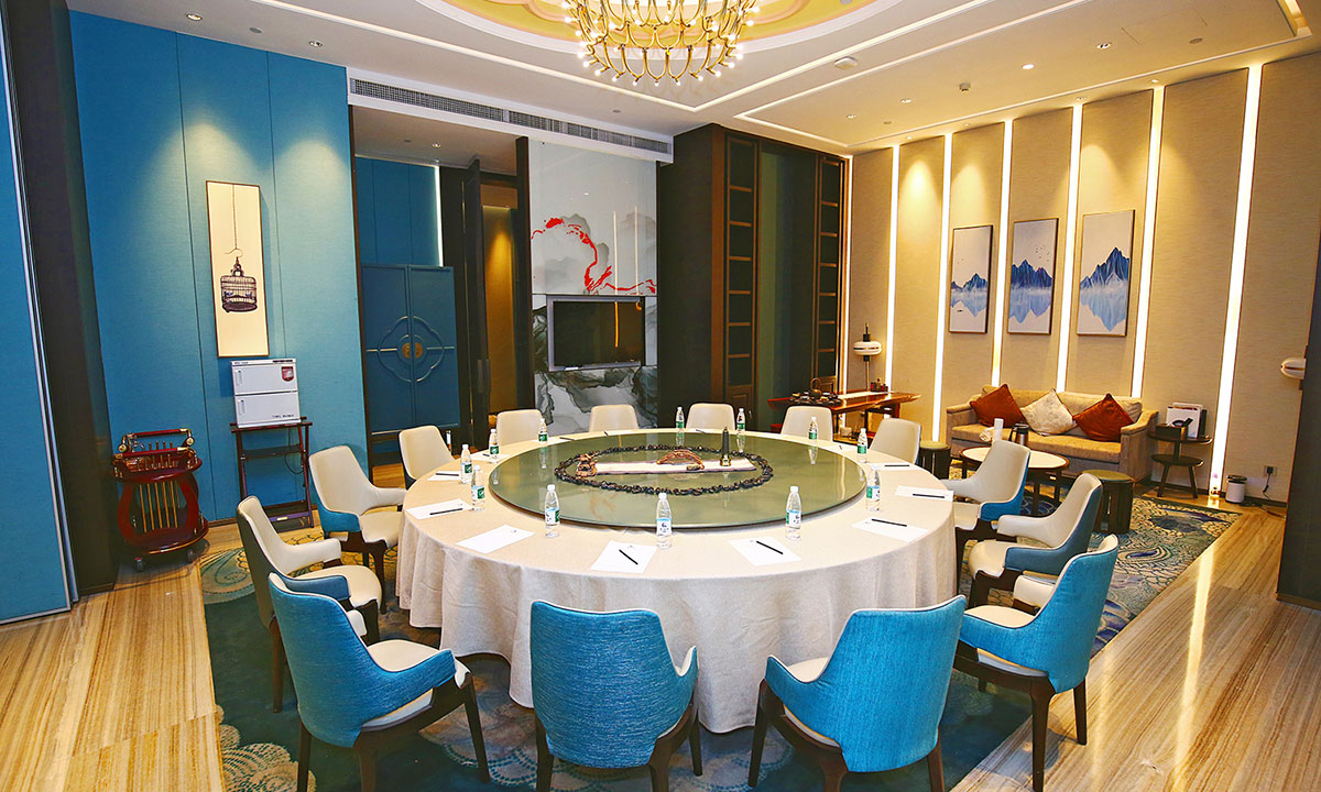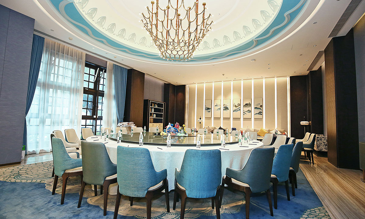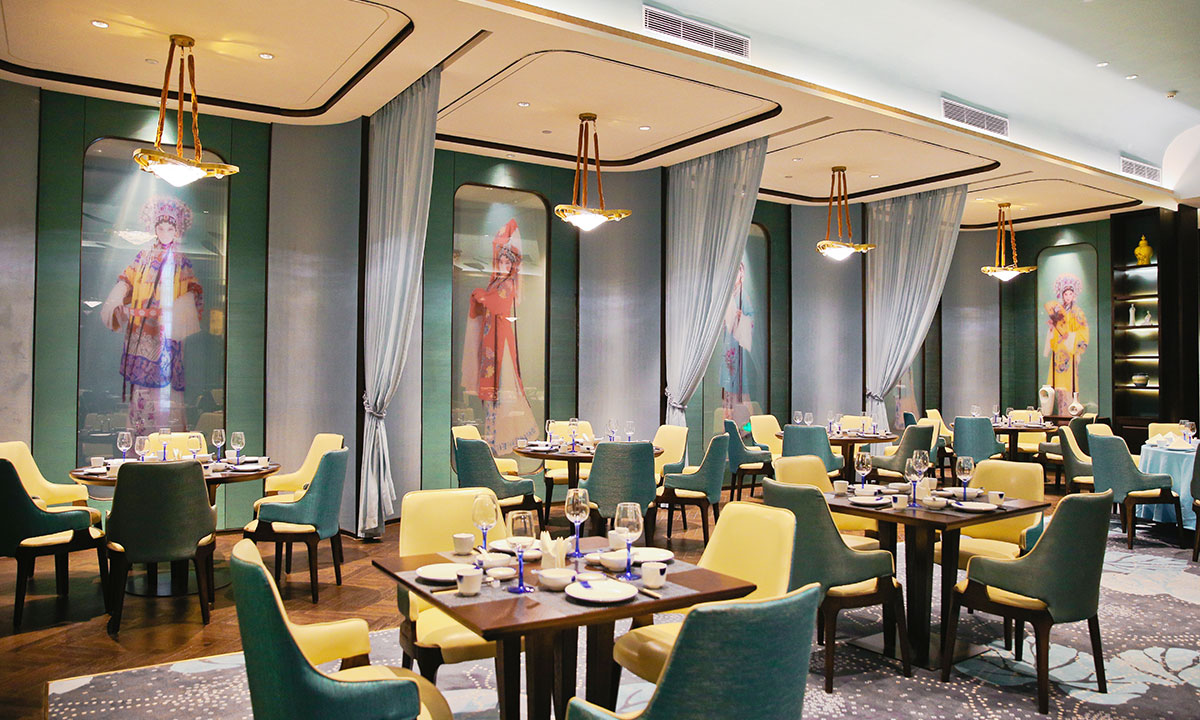 如梦园中餐厅,位于宴会中心一楼,名字由昆曲《南柯记》人生如梦演化而来。内有玉簪、飞花、暗香、莲步等6个主题包厢,以及一个泓璟戏宴主题厅。昆曲主题中餐厅,采用的是蒂芙尼蓝,淡雅静静,夹娟玻璃内也是昆曲人物画像。