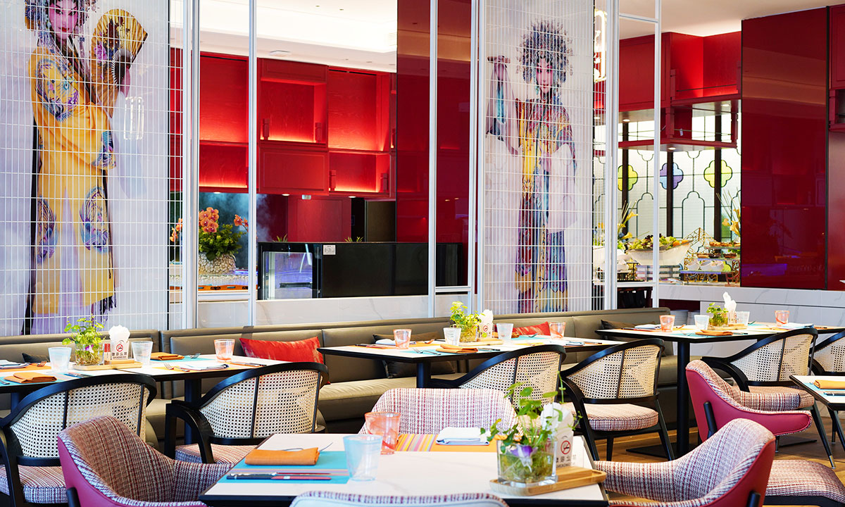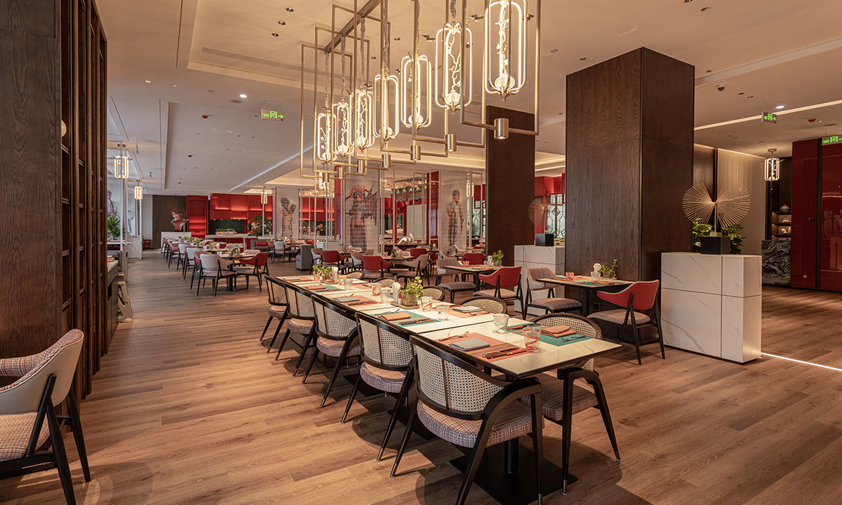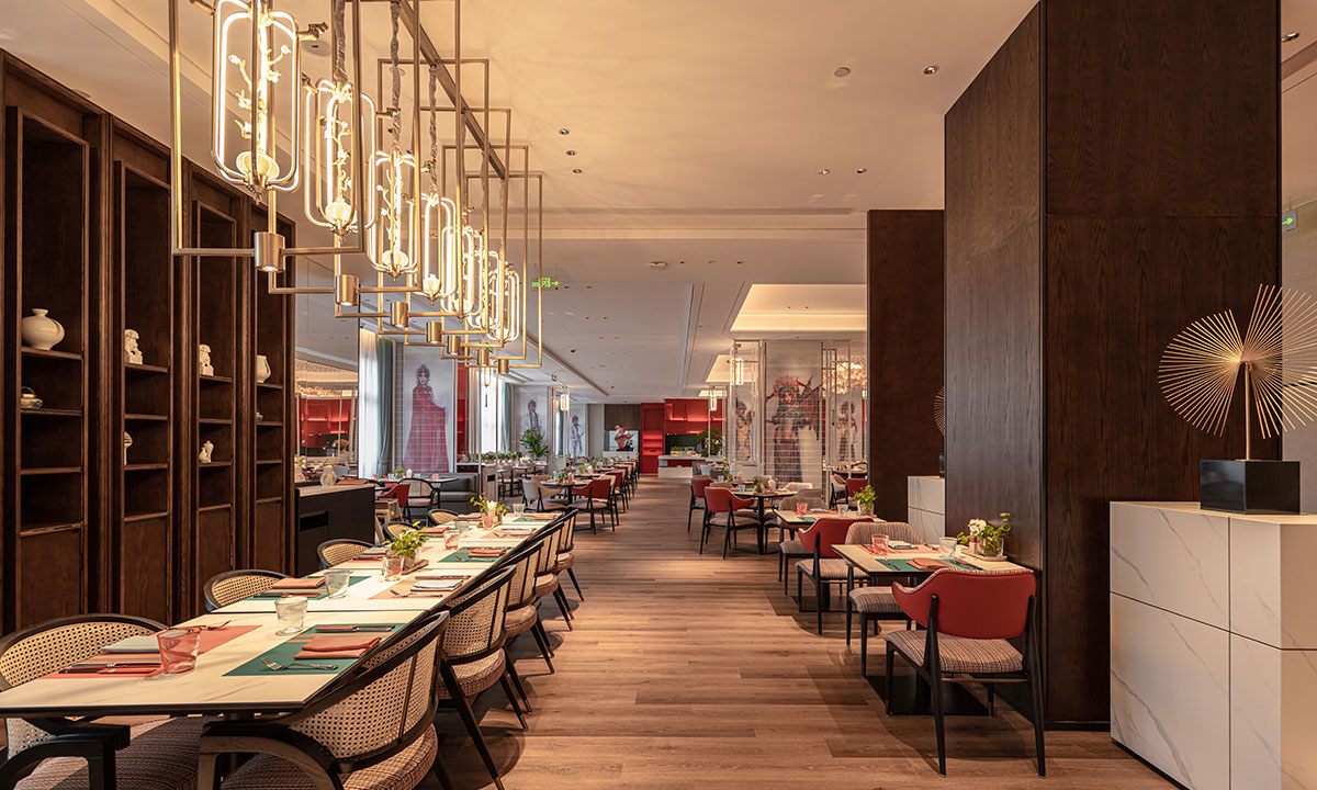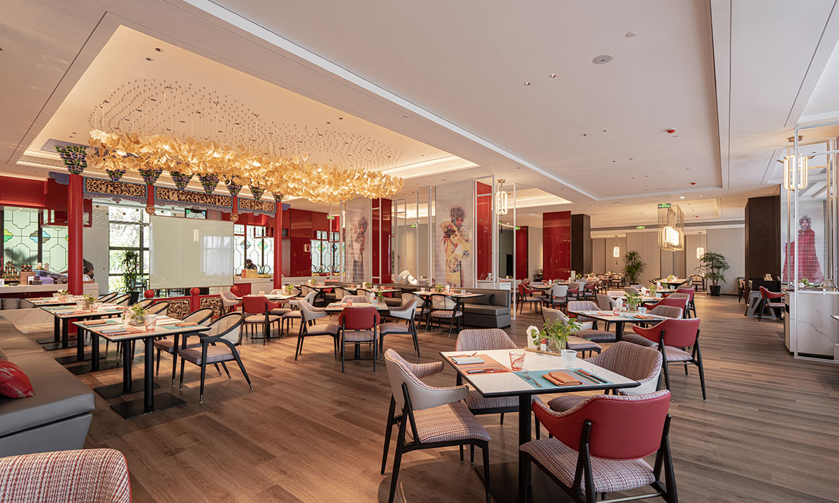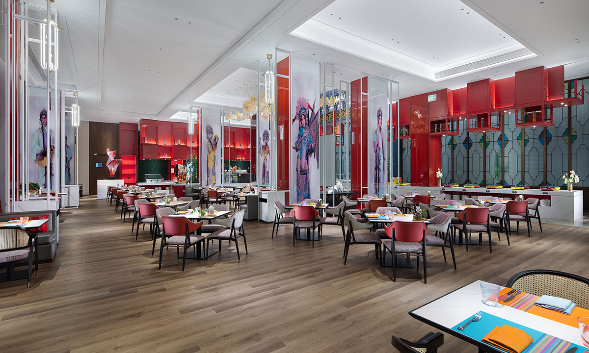四喜园自助餐厅,名字取之京剧里的“四喜班”。在清朝的乾隆年间,扬州的“三庆”、“四喜”、“和春”、“春台”等“四大徽班”,先后进京,为乾隆祝寿演出。四喜园主题餐厅,演绎国粹京剧之国风,刀马旦、脸谱、京剧头饰,以及中国红的色彩烘托,以柔美绚丽的视觉感受,留给宾客难忘的印象。高科技3D屏幕,通过文化互动的方式,传播戏曲文化,展示国粹魅力。